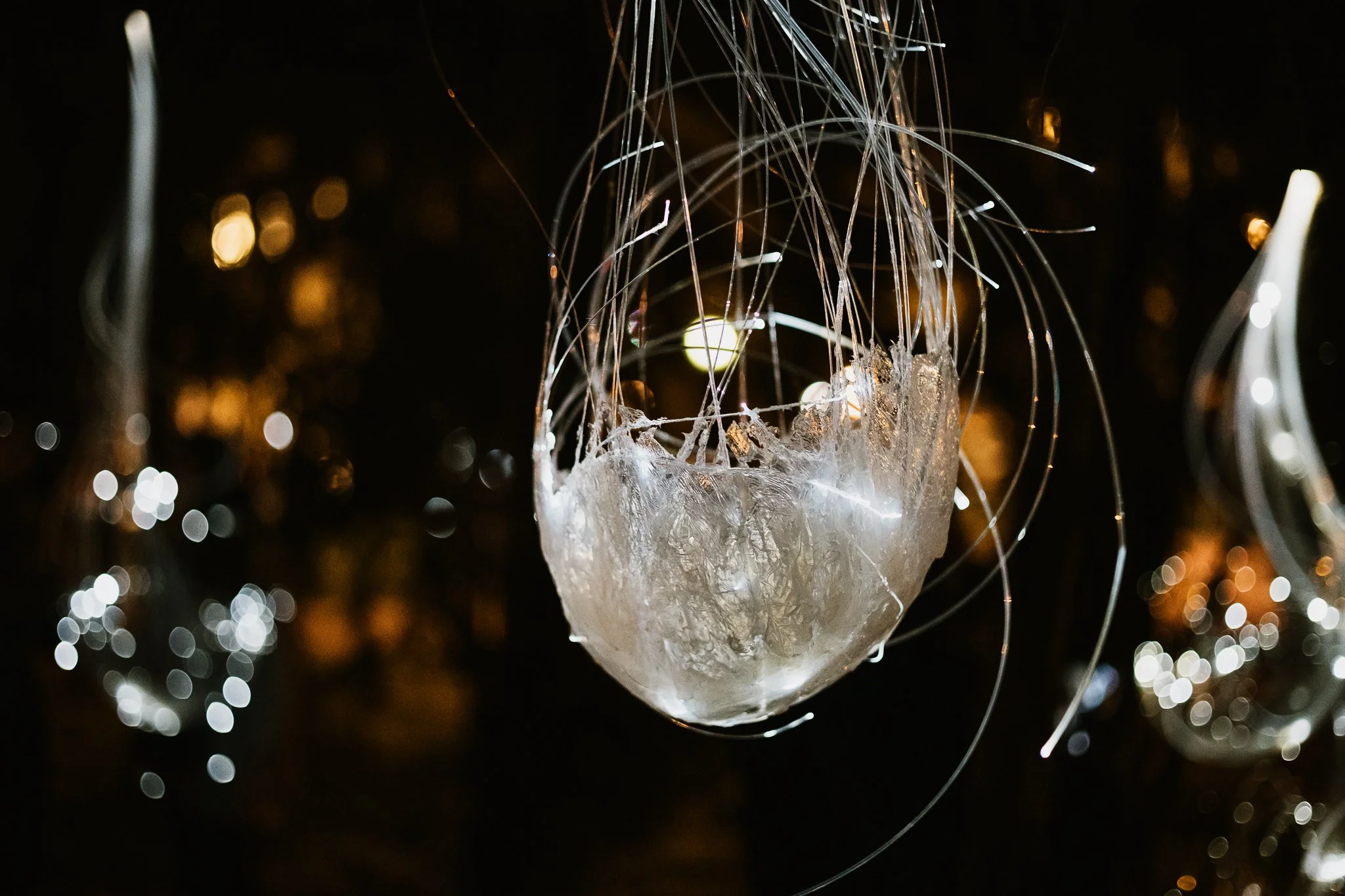Fireflies is a light installation that follows the imaginary life of fireflies and represent the dynamics of their relationships and everyday life. With its organic shape it symbolizes the pupae, or nuclei, in which fireflies rest and sleep before their nocturnal forest dance.