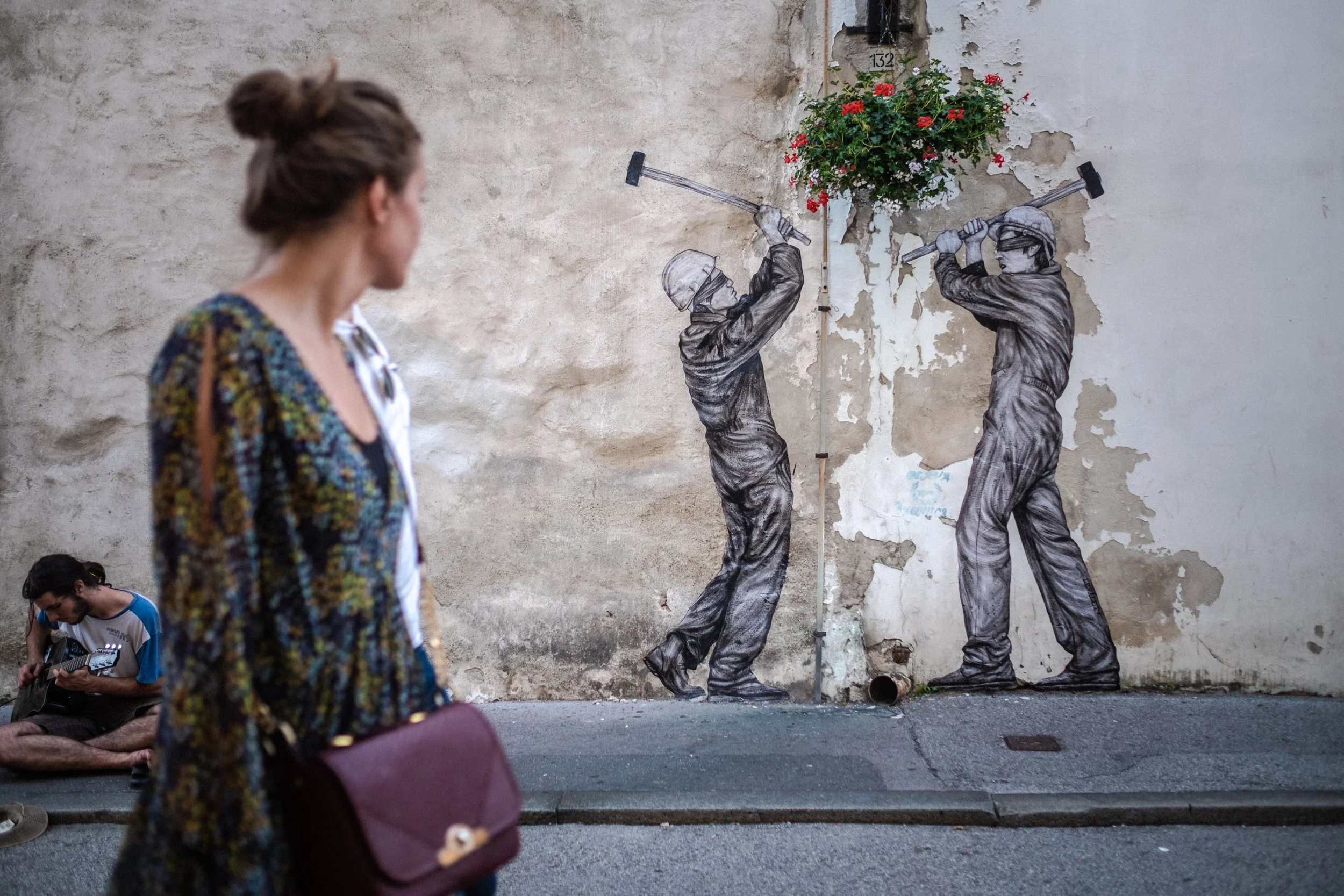 Charles Leval, known as Levalet, was born in 1988 in Epinal. He grew up in Guadeloupe, a region where he encountered urban culture and later visual arts. He continued his studies in visual arts in Strasbourg; his work, then more focused on video, was nourished by a dedicated theatrical practice. He obtained his agrégation (a teaching qualification) in 2012, the year his work began to take place in the streets of Paris and elsewhere. In 2013, he began exhibiting in galleries and participating in international events. Levalet's work is primarily a work of drawing and installation. He stages his characters, drawn in Indian ink, in public spaces, in a visual and semantic dialogue with the surrounding environment. The characters interact with the architecture and unfold in situations often bordering on the absurd.