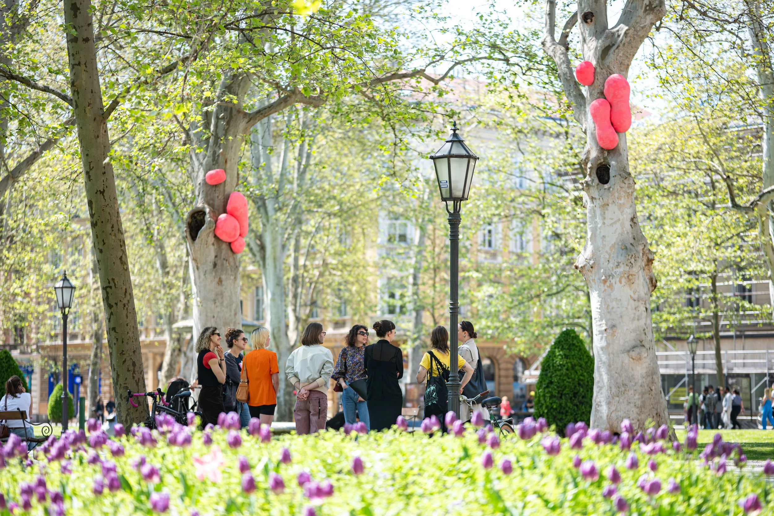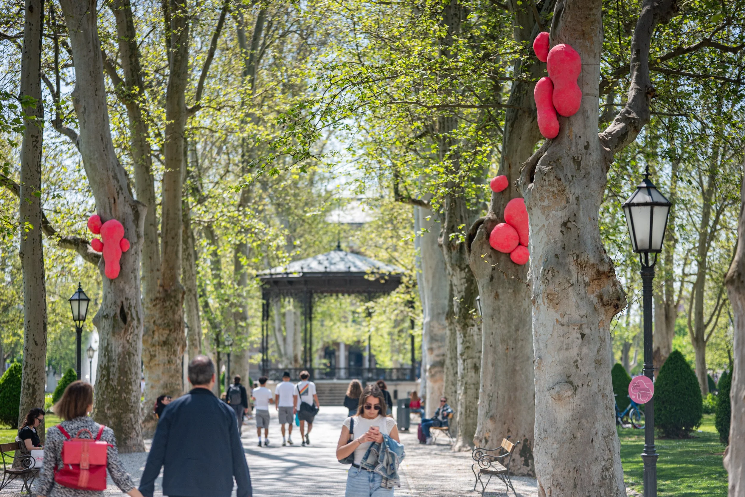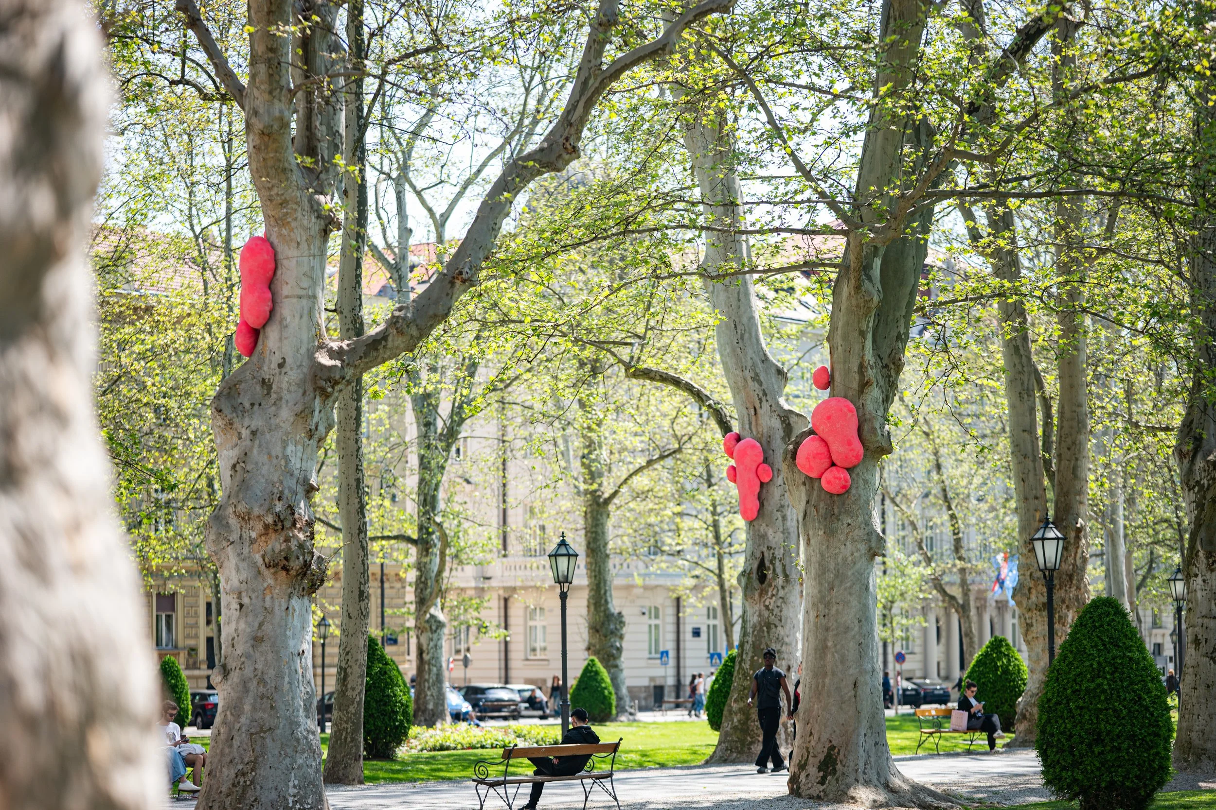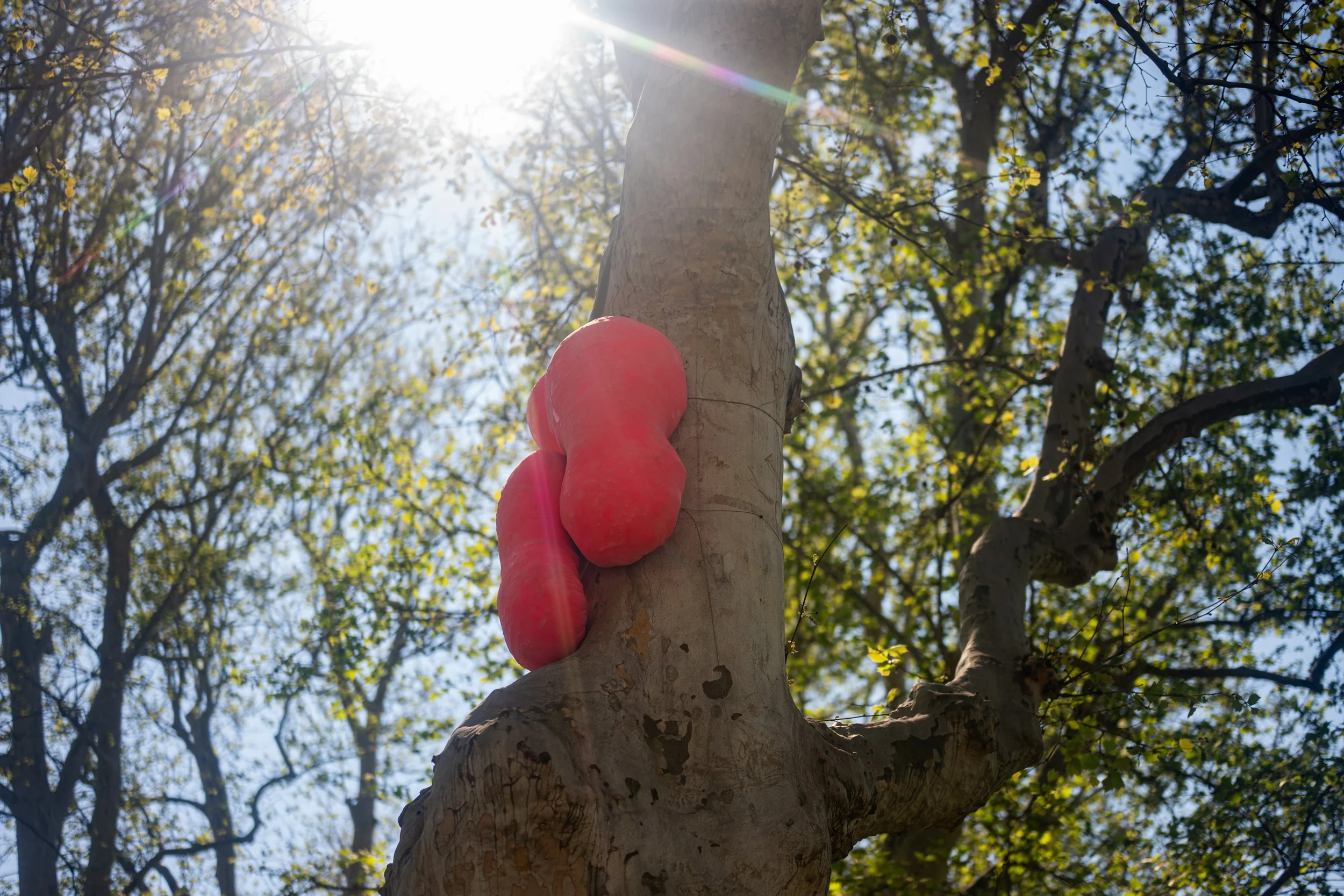 The Round enters the city park where its organic and biomorphic sculptures inhabit selected trees. The shapes are inspired by microscopic organisms whose dimensions are now transformed into visible and tangible forms in direct coexistence with the trees. The pink clusters are made of recycled deadstock stretchy lycra material that allows for the soft presence of newly created individuals. The work speculatively contemplates urban ecosystems in which the relationships between the natural and synthetic environment are redefined and the possibility of temporary cohabitation in a common canopy habitat is opened.